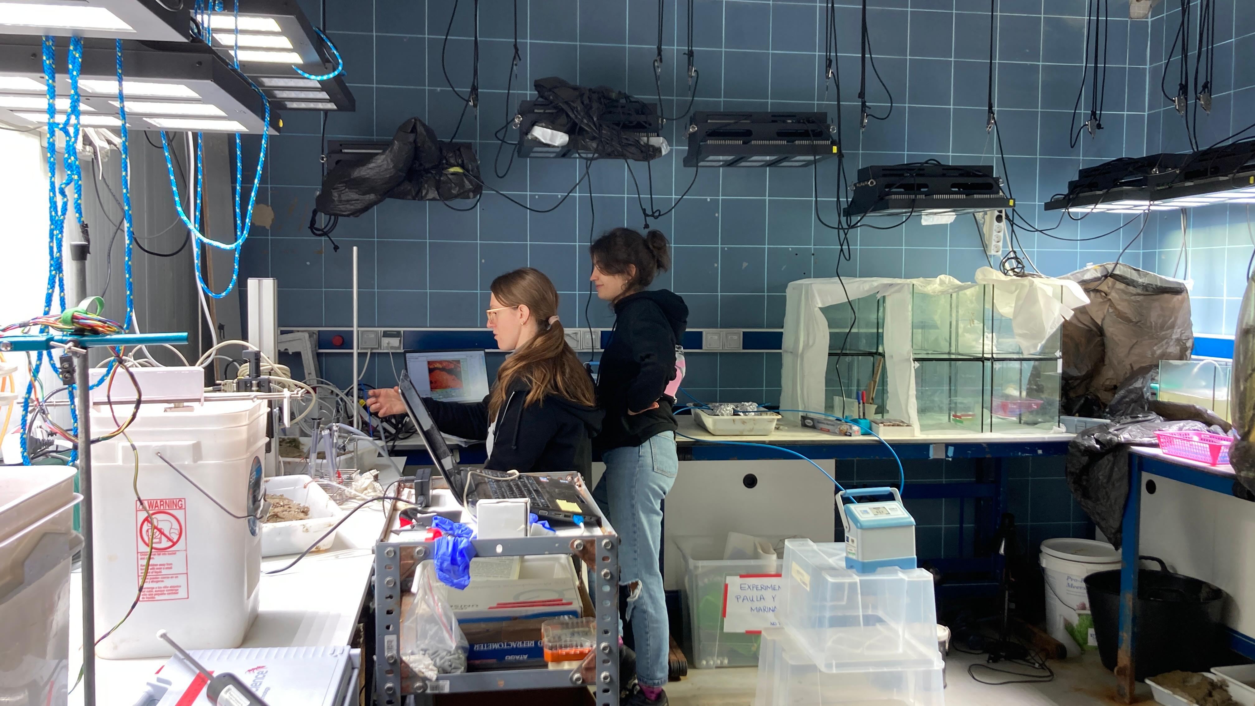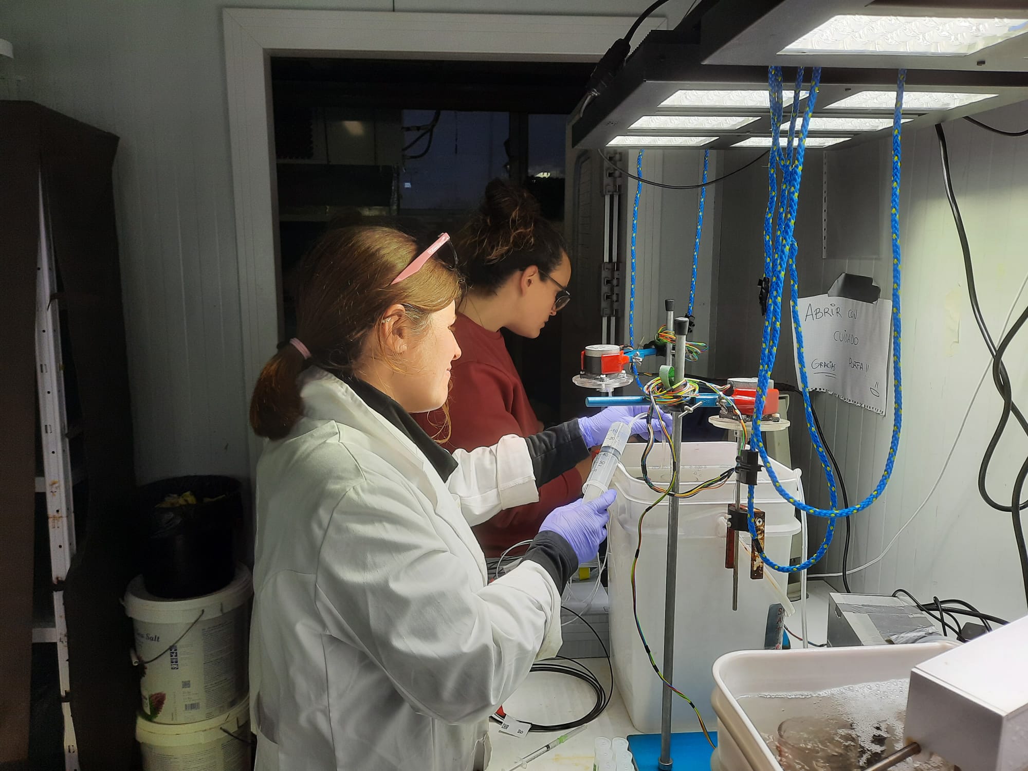 Back in the lab, the campaign continued under controlled conditions. We carried out experiments to estimate CO₂ fluxes using mini chambers under two light intensities, low and high, both representative of winter conditions. These measurements allow us to simulate how microphytobenthic communities respond to seasonal light variability.